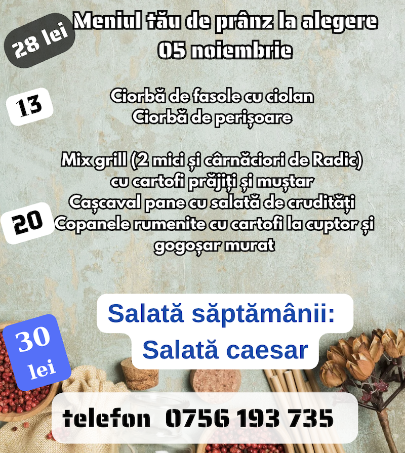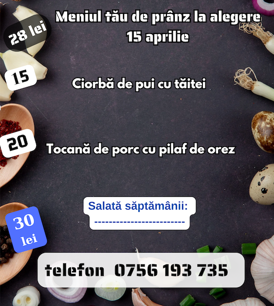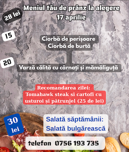 Alege mâncarea dorită! Comenzile se preiau în intervalul 09:00 – 13:00 Doar în limita stocului disponibil Oferim livrări la domiciliu sau ridicare personală. Vă așteptăm la adresa Strada Părăști, nr. 61A sau la 0756193735 0248260287 pentru comenzi telefonice !